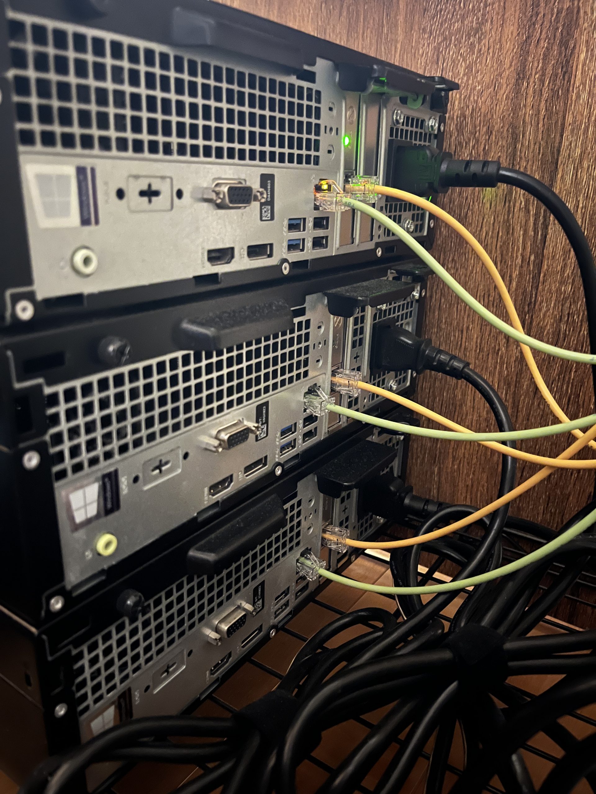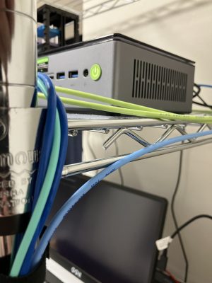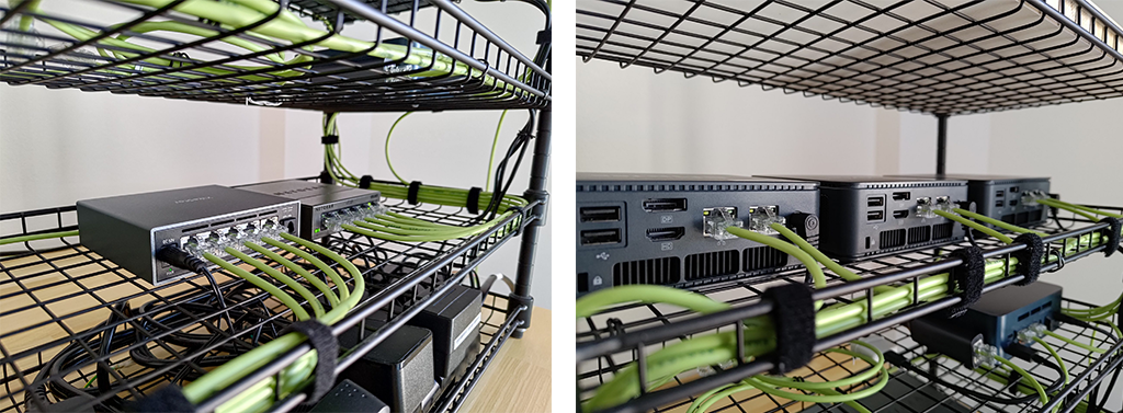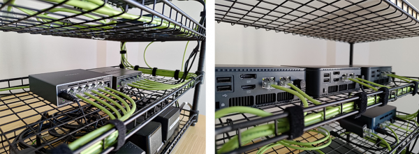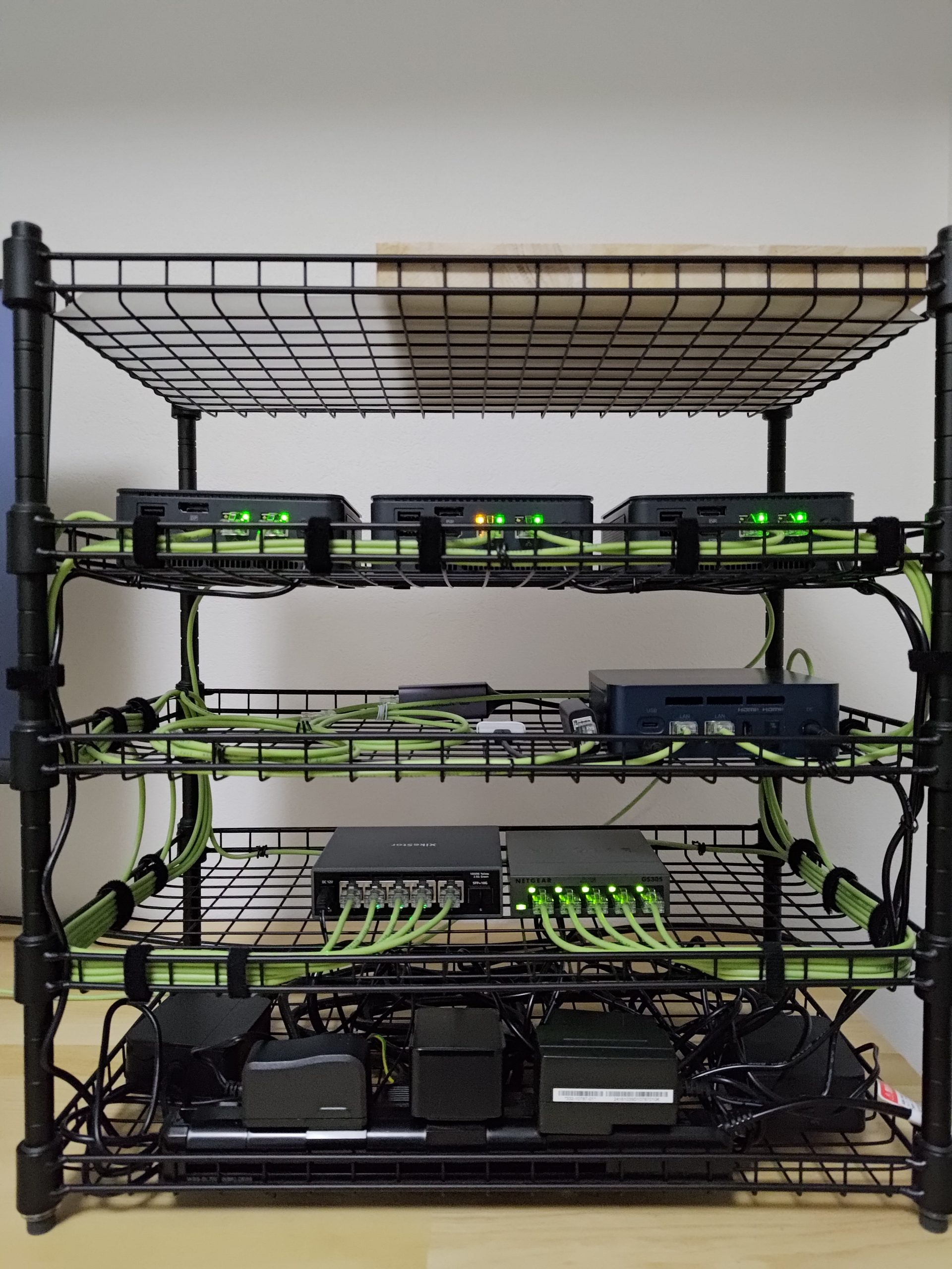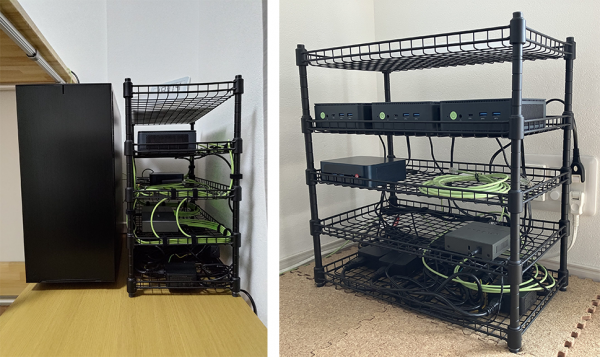 4段目に乗っているミニPCはコンピューティングリソース用、3段目に乗っているミニPCはルータ用として稼働を予定しております。