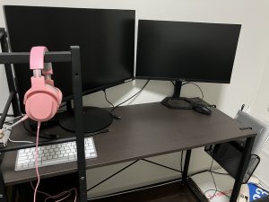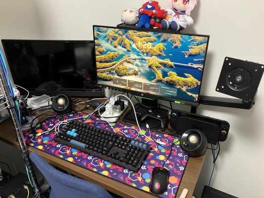 ここには映っていないのですが、KVMスイッチを置いて入出力を切り替えるようにしています。メインマシン(windows)/macbook air/業務用PCを切り替えられるので重宝しています。(家のほうが作業しやすいのは内緒)