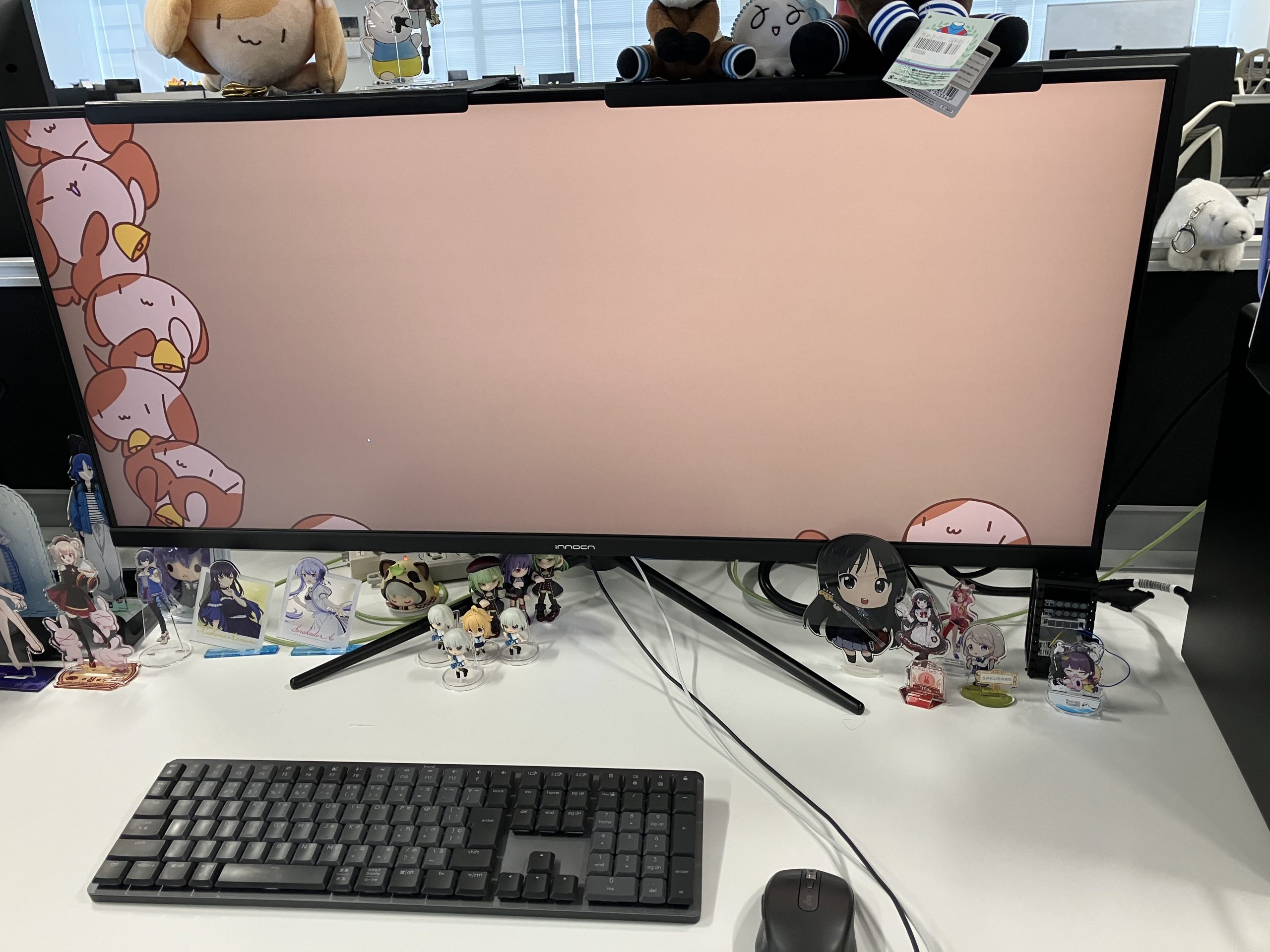 ワイドスクリーンモニターは結構気に入っています。ターミナルを複数開く作業などでも大変重宝しております。背景は弊社障害対応マスコットのバリーくんです。