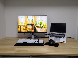 リモートワークの際は写真のキーボートの位置にノートPCを置き、ディスプレイの配線を差し替えて作業しています。