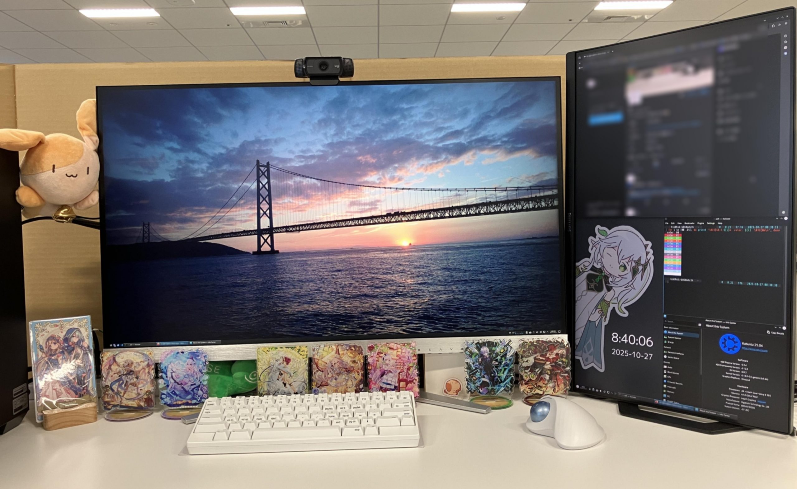 31インチ4Kモニタ+WQHD 縦置き24インチモニタを配置しています。