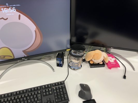 オフィスとは思えないぐらいいろいろなグッズが置いてあります。これは入社前にこちらの記事を見て「オフィスに私物置けるんだ 置いちゃお」という軽い気持ちで1個づつ置いていたらいつの間にかこんなことになってしまいました。