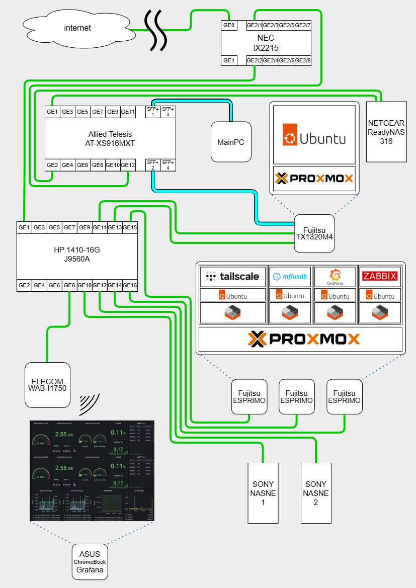 サーバーは Proxmox を使用して Fujitsu ESPRIMO と PRIMERGY TX1320M4 でクラスタを構築しています。各サービスは LXCコンテナ上で稼働させ、メインサーバーには Ubuntu をVMで導入しています。