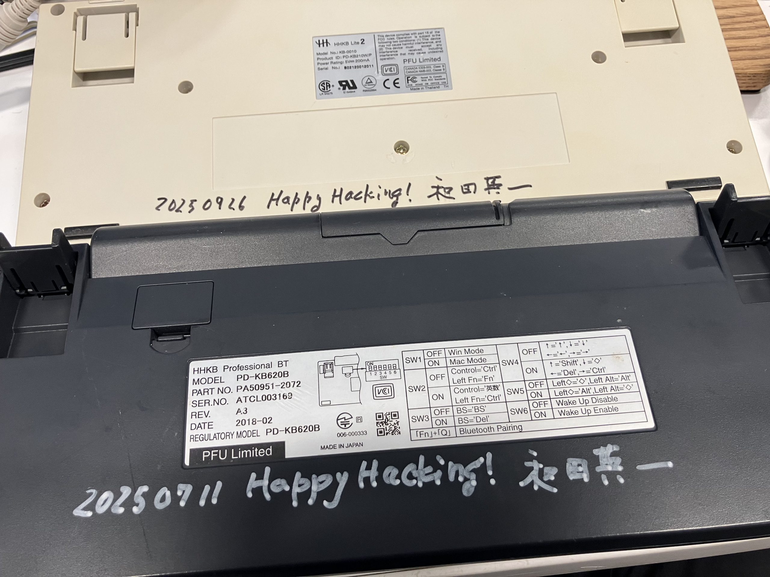 このLite 2とBTはHHKBの配列の原案である「Alephキーボード」を考案した、IIJ技術研究所にて研究顧問を務める和田英一先生のサインが入っています。