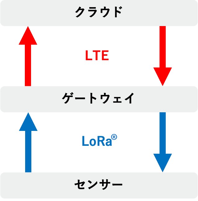 SDMSは現在、LoRaWAN®という通信プロトコルを利用したセンサーおよびゲートウェイに対応しています。 センサーから取得したデータはLoRaWAN®のプロトコルを利用しながら、LoRa®とLTEという二つの無線通信を介してクラウドに送られます。