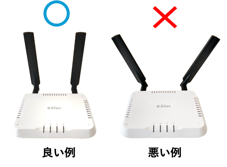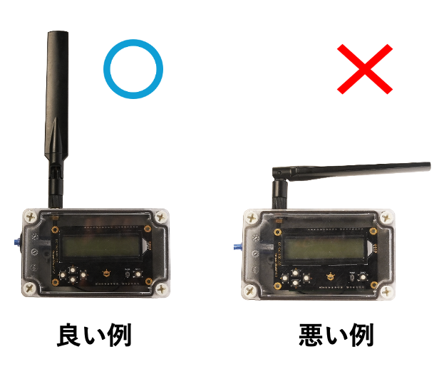 ゲートウェイは電源を接続すると自動で起動し、完全に立ち上がるまで3〜4分待ちます。 アンテナは以下のように垂直に立てて設置してください。 可能な限り高く遮蔽物の影響が少ない場所にゲートウェイを設置するとより広い通信範囲を確保できます。