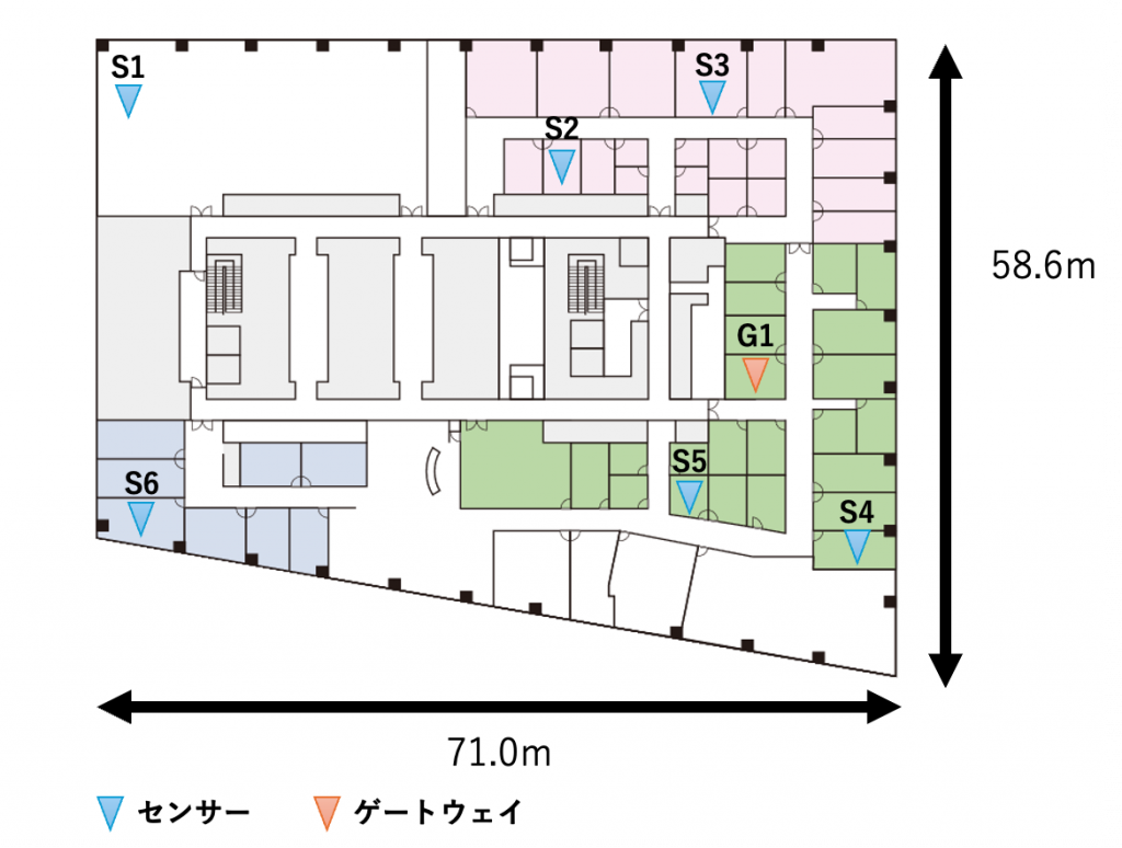 実際にオフィスの中で調査をしてみました。センサー6台、ゲートウェイ1台を設置する予定でした。事前調査では、センサーの代わりに電波測定デバイスを配置して通信状況を確認していきます。
