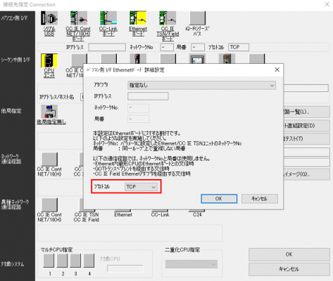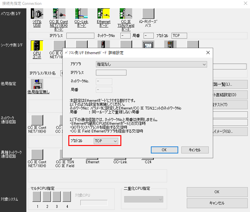 - 「パソコン側IF」の「Ethernetボード」を選択します。ここでは、プロトコル設定を「TCP」とします。