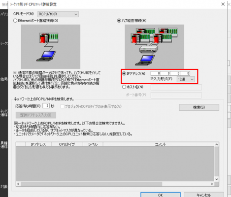 - 「ハブ経由接続」を選択し、IPアドレス設定にルータに挿入されているSIMのIPアドレスを入力します。