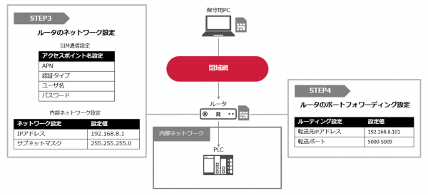- 保守用PC → 閉域網 → ルータ(SIM側IP) → PLC(LAN側IP)