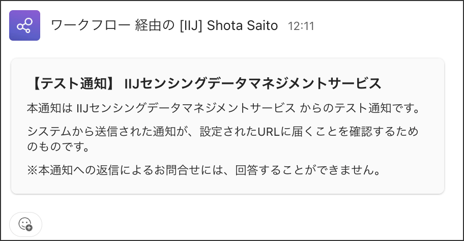 成功すると、以下のようにTeamsのチャネルにテスト通知が送られます。SDMSの画面に戻り「新規登録」を押すことで、通知先として正式に登録できます。