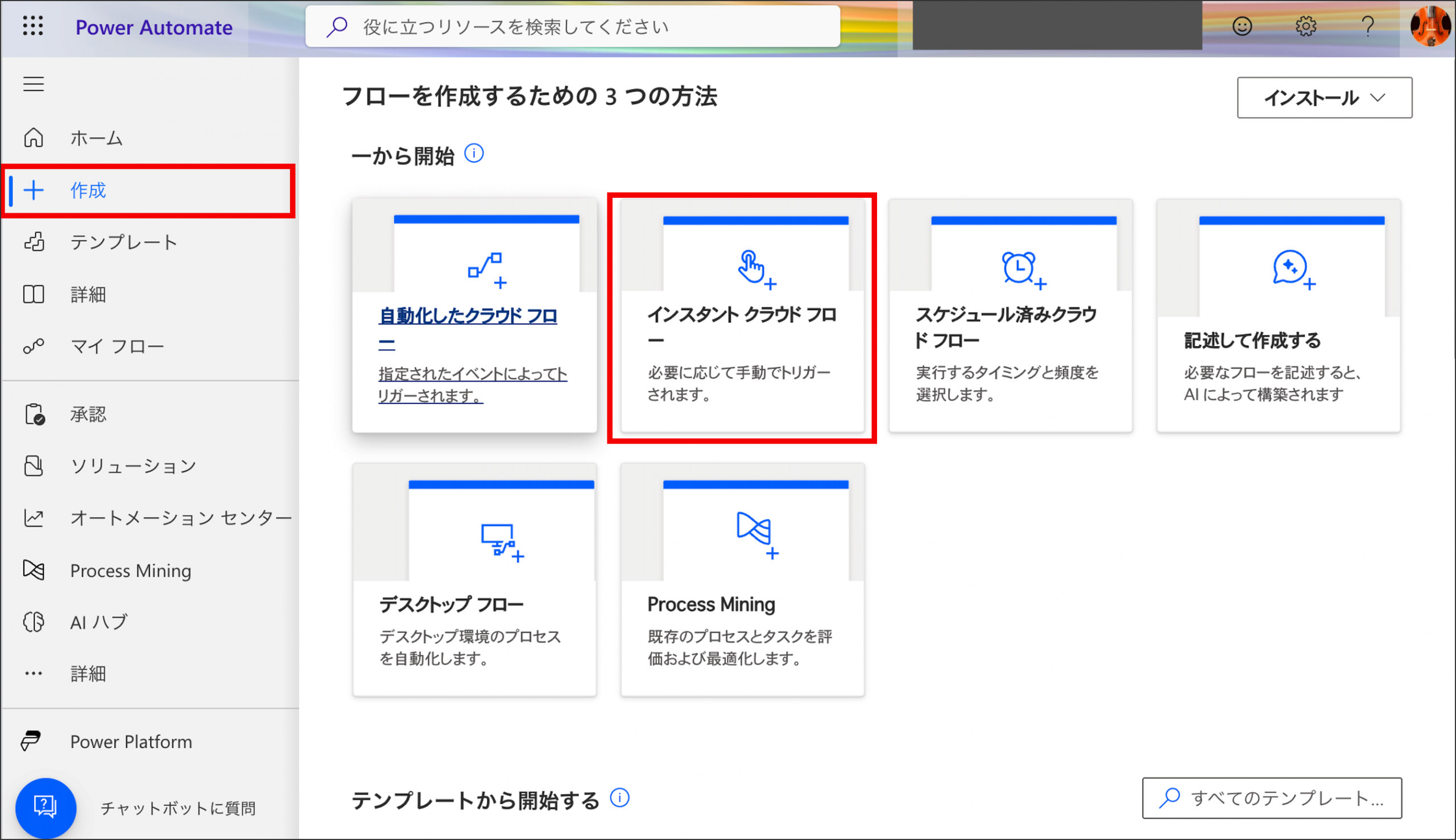 ブラウザでPower Automateにアクセスし、左メニューの「作成」→「インスタント クラウドフロー」をクリックします。