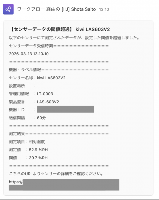 ちなみに、利用中のセンサーが閾値を超過した場合の通知は以下のような形になります。