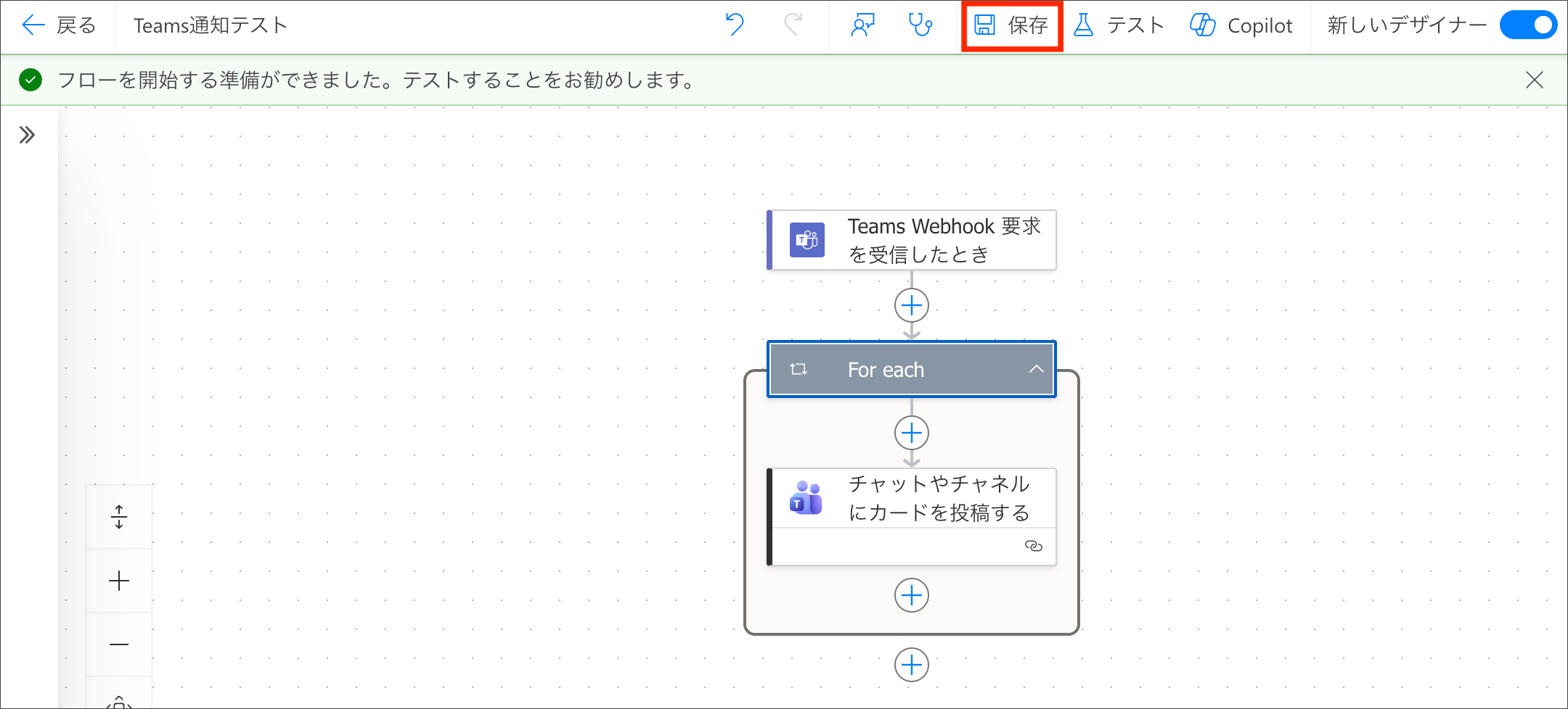 最終的なフローは以下のとおりです。上側の「保存」ボタンをクリックし、フローを確定させます。
