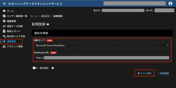 コピーしたURLを、SDMS(ユーザー用画面)の通知設定新規登録フォームの「Webhook URL」の部分に貼り付け、「テスト送信」をクリックします。