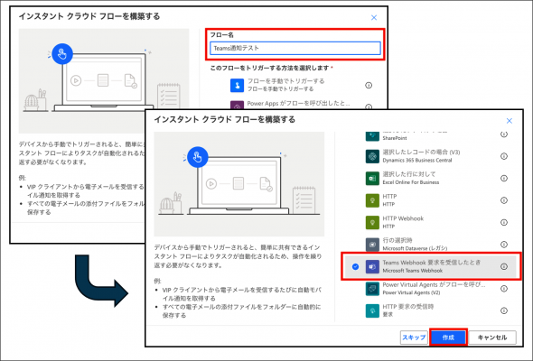 フロー名を任意の文字列(今回は「Teams通知テスト」で設定)し、「このフローをトリガーする方法を選択します」についてはウィンドウの下部にある「Teams Webhook 要求を受信したとき」をチェックした後、「作成」をクリックしします。