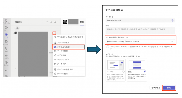 チームの「…」メニュー(その他のチームオプション)から作成します。チャネルの種別は「標準」を推奨します。
