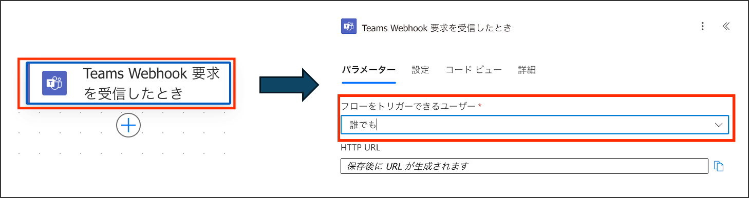 フローの編集画面が出てくるので「Teams Webhook 要求を受信したとき」をクリックし、フローをトリガーできるユーザー「誰でも」に設定します。