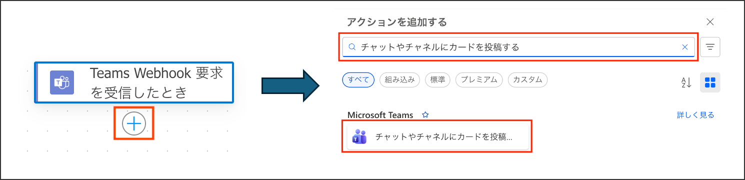 フロー編集画面の+ボタンをクリック後、「アクションを追加する」画面の検索窓に「チャットやチャネルにカードを投稿する」を入力し、ヒットした同名のTeamsのアクションを選択します。