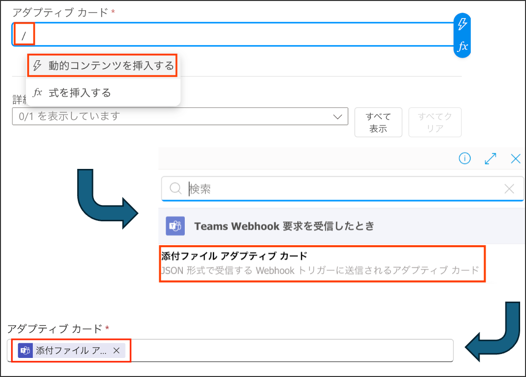 アダプティブカードの部分にスラッシュを入力し「動的コンテンツを挿入する」をクリックしたあと、「添付ファイル アダプティブ カード」をクリックし、反映されることを確認します。