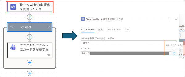 SDMSと連携するため、WebhookのURLを取得します。フローの編集画面で「Teams Webhook要求を受信したとき」を再度クリックするとHTTP URLが生成されているのでコピーします。