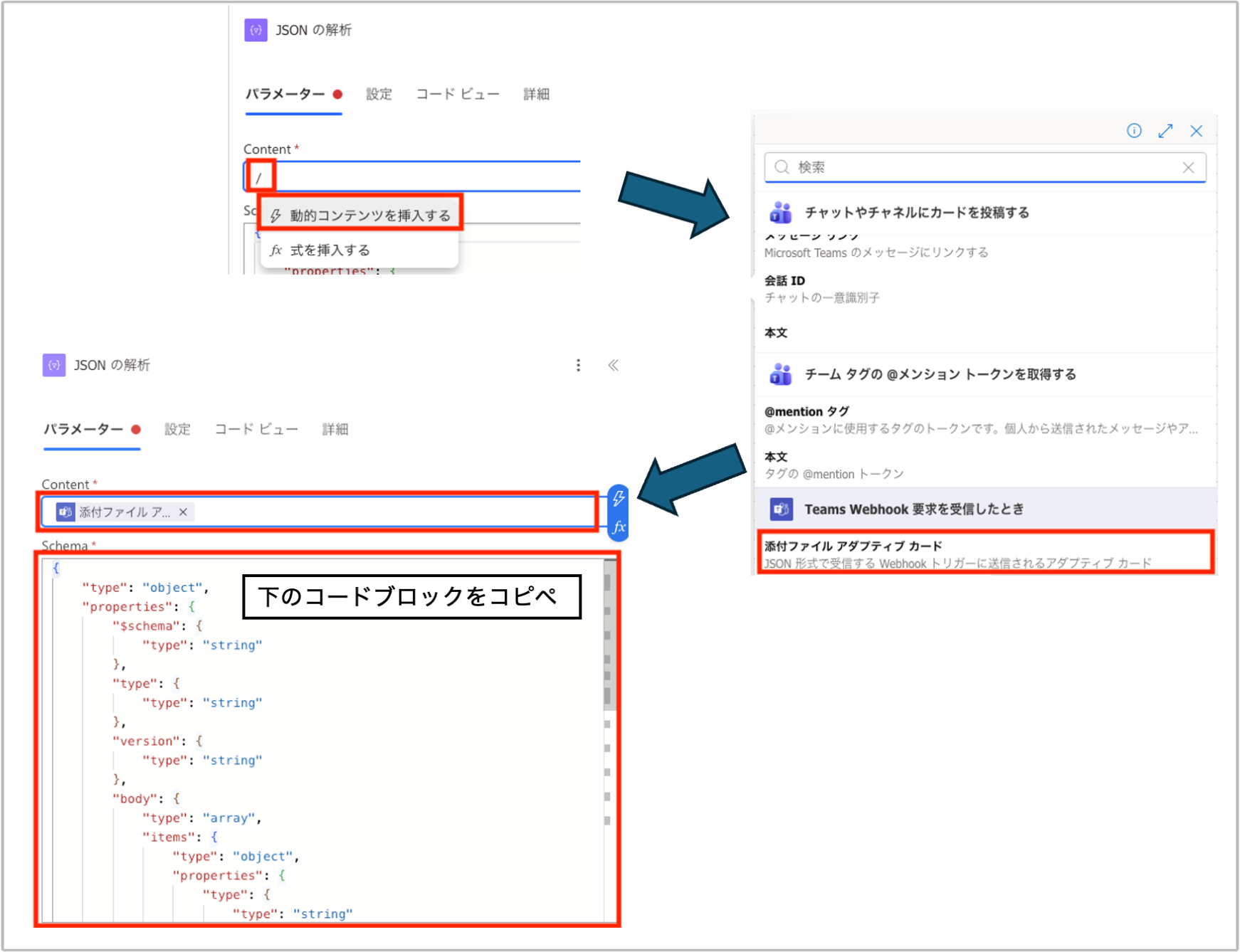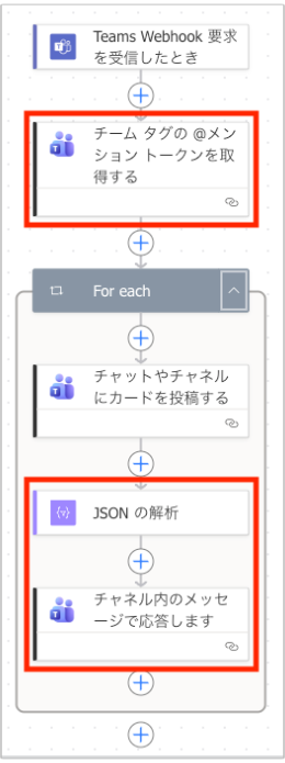 - 「JSON の解析」: アダプティブカードのJSONの中身を読み込めるようにします