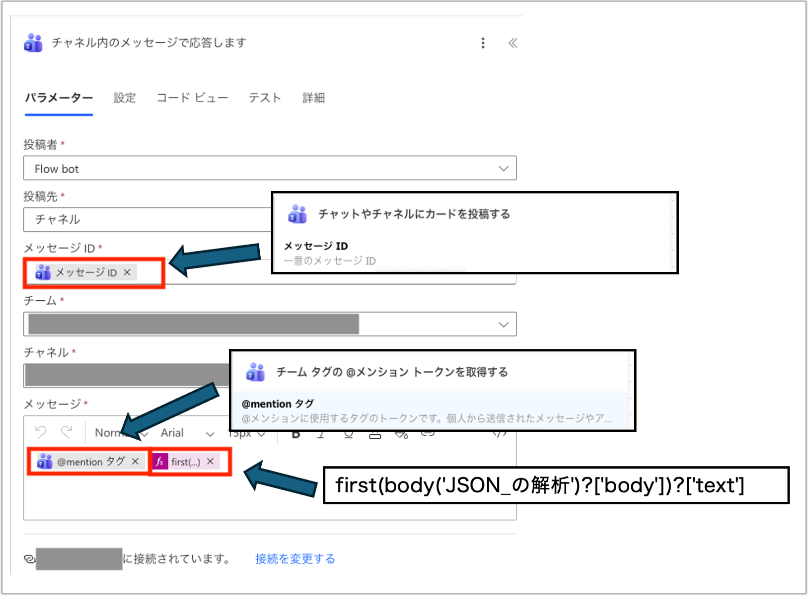 - アダプティブカードの本文を取り出してテキストとして再構成し、「チャットまたはチャネルでメッセージを投稿する」のアクションでメンションとともに投稿