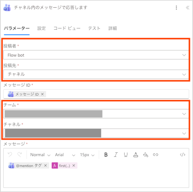 - チーム/チャネル: 投稿先を指定