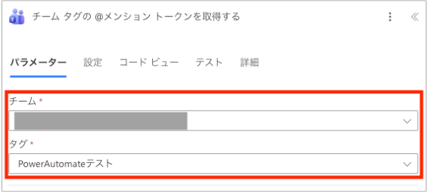 ここは、対象とするチームに設定されているタグを選択するだけでOKです。今回の例では、「PowerAutomateテスト」のタグを設定しています。